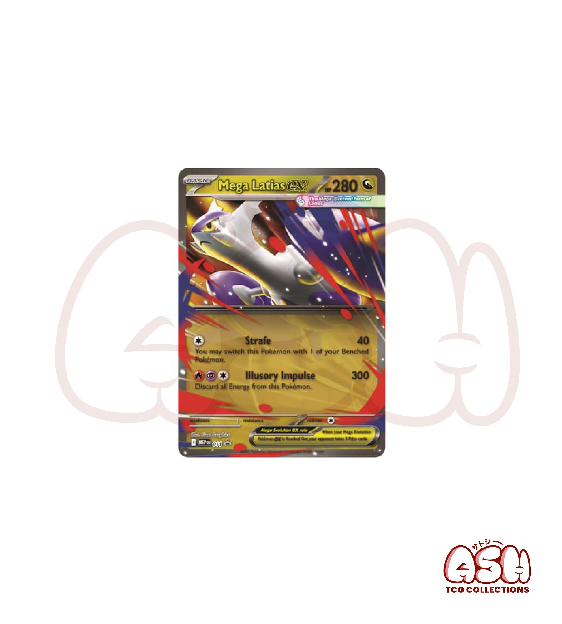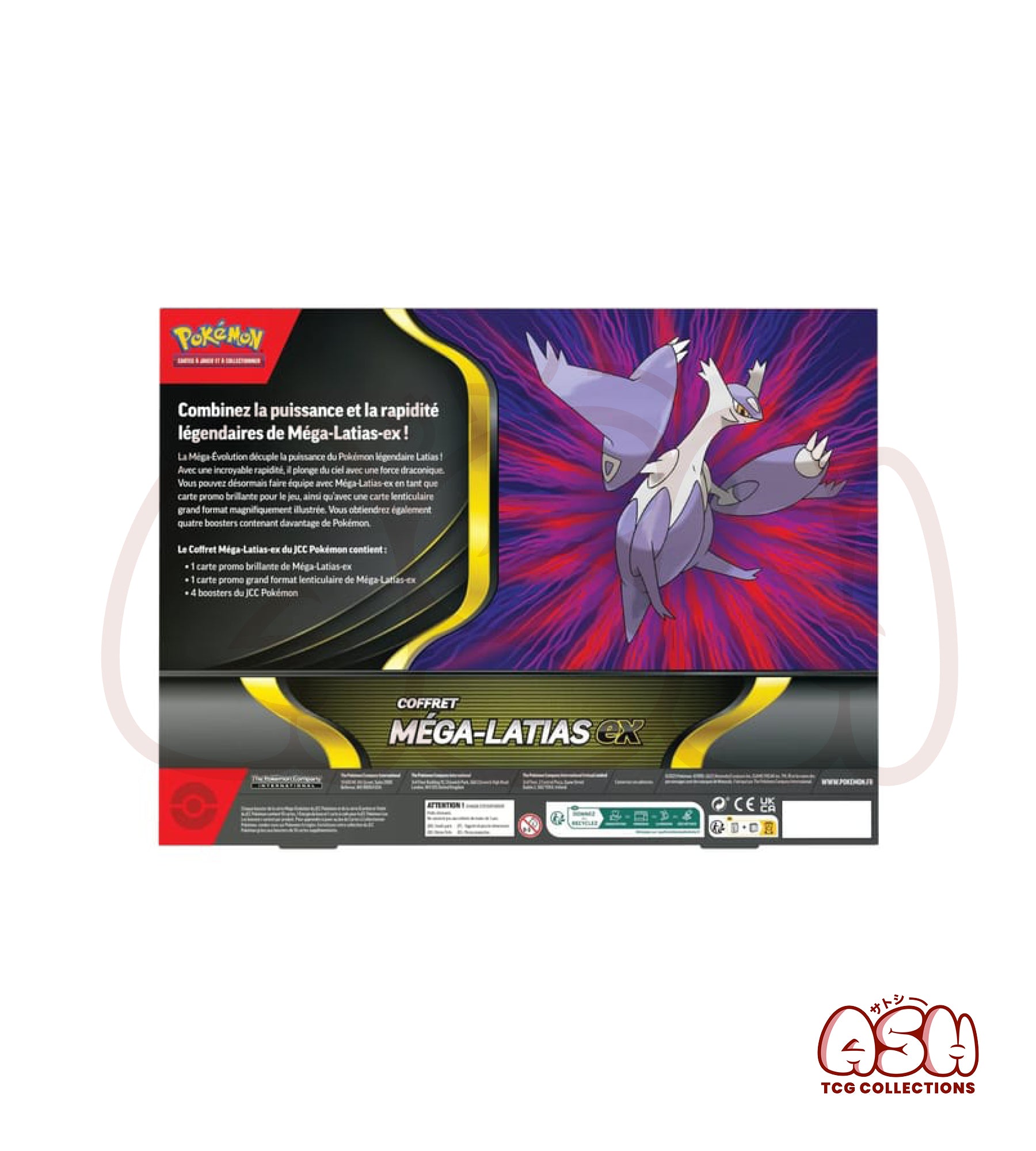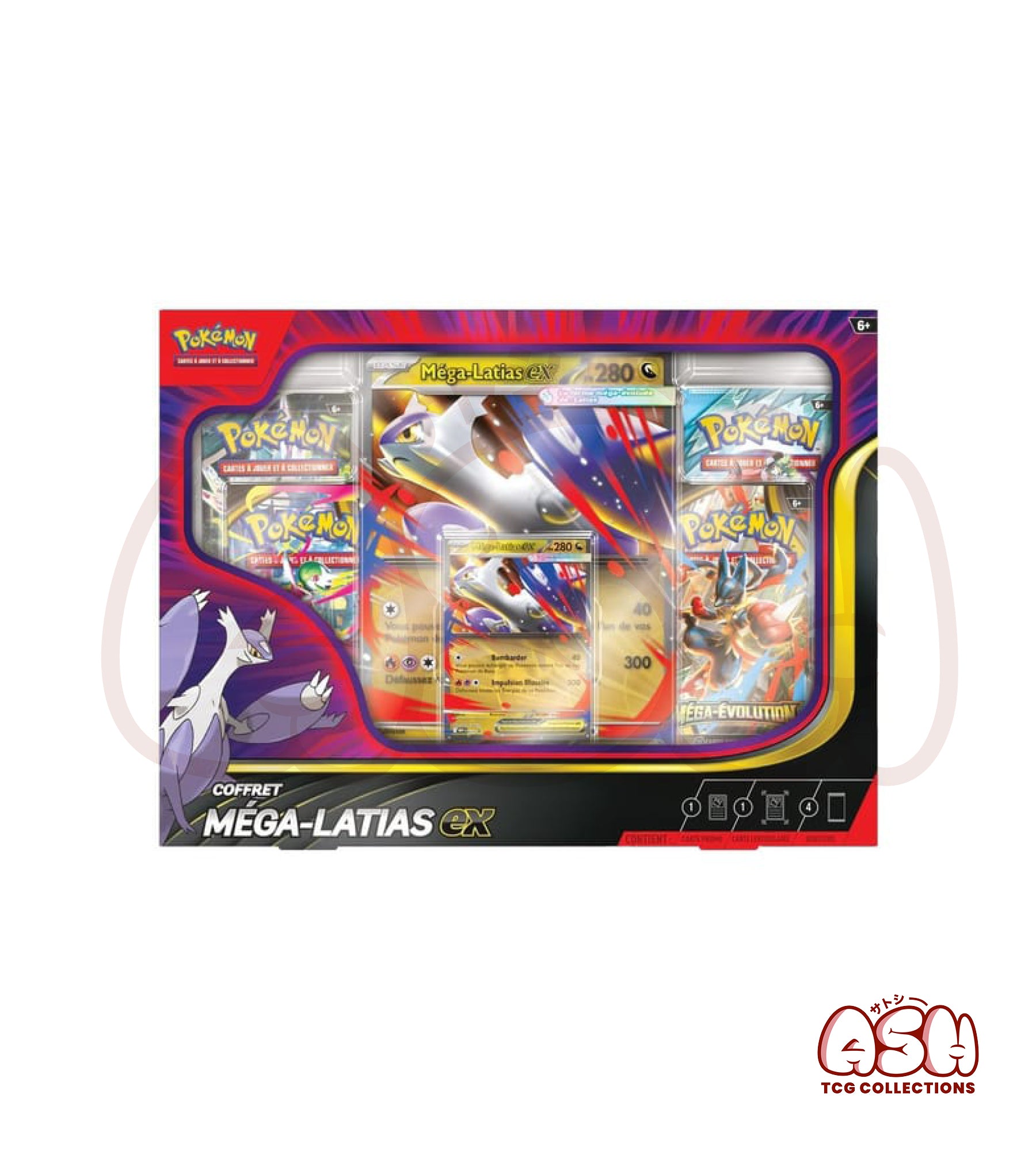 La Méga-Évolution décuple la force du Pokémon légendaire Latias, capable de fondre sur ses adversaires avec une puissance draconique inégalée. Dans ce coffret exceptionnel, retrouvez Méga-Latias-ex sous la forme d’une carte promo brillante et d’une grande carte lenticulaire magnifiquement illustrée.